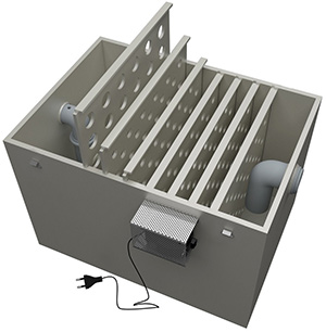 По типу внутреннего устройства разделяют горизонтальные и вертикальные жироуловители. Горизонтальный жироуловитель под мойку (жироловка) - отличное решение для производства предварительной очистки сточных вод небольших объемов. Такой вариант очень удобен для заведений общественного питания. Все осадки остаются внутри контейнера, и вам необходимо будет только периодически его очищать. Уже давно доказано, что септики и канализационные системы в целом работают гораздо эффективнее, если сточные воды прошли предварительную очистку через жироотделитель.
